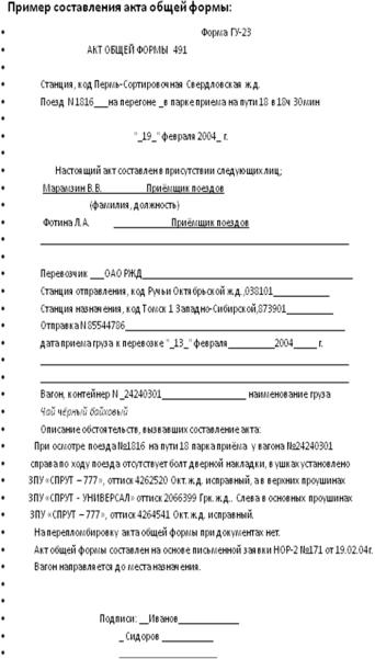 Акт общей формы. Описание в нем должно быть достаточным для определения виновника и размеров ответственности. По каждому конкретному случаю есть детальные рекомендации в Правилах Перевозок.