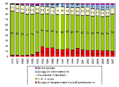 Как видно, оплата труда остается основным видом денежных доходов населения, хотя роль ее заметно снизилась в 90-е годы: если ранее она обеспечивала более 3/4 совокупных денежных доходов, то в 1993-2006 годах - около 2/3.