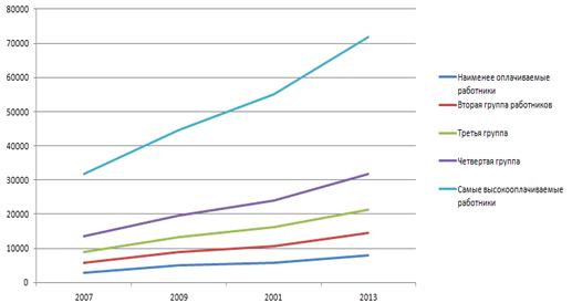 На графике, приведенном на рисунке 6, можно проследить динамику среднего заработной платы 5 групп населения за период с 2007 по 2013 г. [15]. По вертикали - месячный доход, руб.
