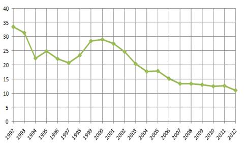 Откуда видно, что в начале девяностых годов в России произошло резкое падение уровня жизни, что было связано с проведением либеральных реформ и распадом Союза. В 1992 году 33,5 % населения оказались за чертой бедности- то есть получали доходы ниже величины прожиточного минимума. Следующий скачок уровня бедности последовал за дефолтом 1998 года. Постепенное снижение численности малообеспеченных слоев населения началось в 2000 году. По последним данным к 2012 году уровень бедности снизился до 11 %.