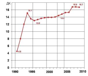 Видно, что в 1991 значение ДК равнялось 4,5, в 1994 - уже 15,1. В период 1996 - 2007 гг. значение ДК выросло на 30% с 13 до 16,8 раз. В последние годы 2008 - 2010 гг. величина ДК оставалась практически на постоянном уровне - 16,8 - 16,7.