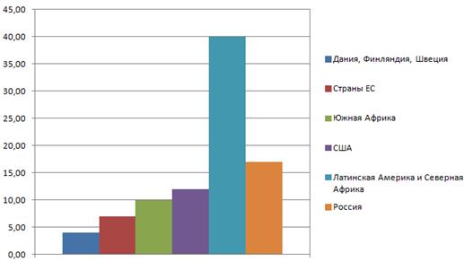 странах: Дания, Финляндия, Швеция - 3 - 4; в странах ЕС - 5 - 7, Южная Африка -