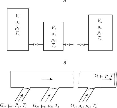 водами с установленными на них кранами (рис. 18а). В каждом резервуаре объемом Vi находится один компонент с известными исходными параметрами (Gi , i , pi , Ti ). После открытия кранов во всех резервуарах происходит выравнивание давления pm, а затем температуры Tm и концентра-