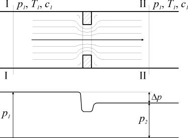 В процессе дросселирования изменение скорости газа или пара очень мало и можно принять скорость потока в сечении (I-I), расположенном до местного сопротивления, равной скорости потока в сечении (II-II) после местного сопротивления (рис. 25).