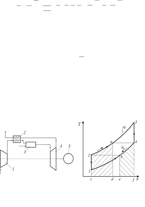 нератор (2), где подогревают сжатый воздух, сжатый в компрессоре (1) перед его поступлением в камеру сгорания (3). Таким образом, при постоянной температуре газов перед турбиной Т3 сжатый воздух после компрессора на участке (2 – а) изобары (2 – 3) подогревается отходящими из турбины газами и только на участке (а – 3) он нагревается за счет сжигания топлива. Площа-