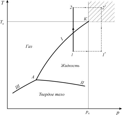 можен кратчайшим путем по линии 1-2. Можно этот переход осуществить через закритическую область, то есть без изменения агрегатного состояния,