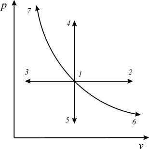 1-2, 1-3 – изобары; 1-4, 1-5 – изохоры; 1-6, 1-7 – изопотенциальные процессы