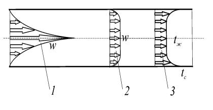 тины движения жидкости. В теплообмене участвует только пристенный по-