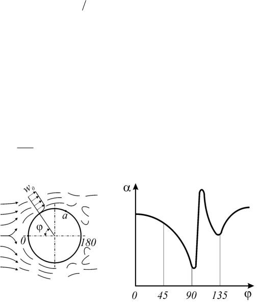 Рис. 11. Схема движения и график изменения коэффициента теплоотдачи при поперечном обтекании трубы