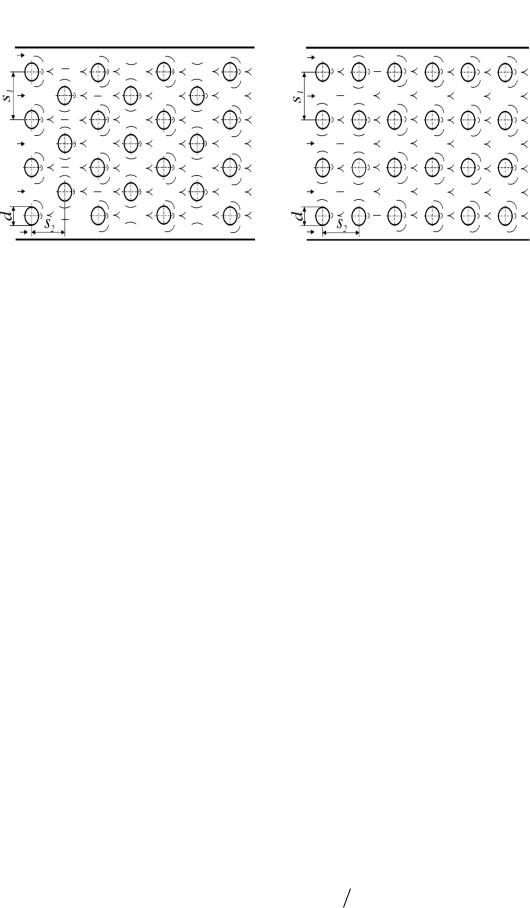 Рис. 12. Схемы расположения труб в пучках: (а) – шахматное; (б) – коридорное расположение ( S1 ,S2 – поперечный и продольный соответ-