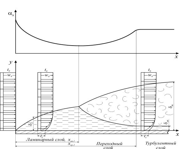 При обтекании плоской поверхности жидкостью около поверхности стенки образуются два пограничных слоя: гидродинамический и тепловой. В