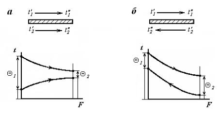 Рис. 25. График изменения температуры теплоносителей при прямотоке (а) и противотоке (б)