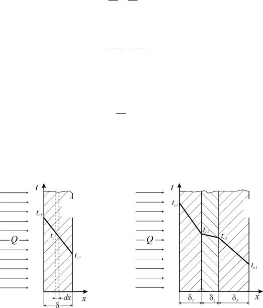 Рис. 2. Теплопроводность плоской однослойной (а) и многослойной стенки (б)
