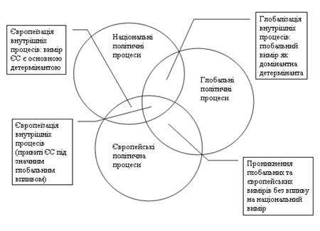 Графічно це відношення може бути зображено у вигляді трьох кіл, які відображають національні, європейські та глобальні політичні процеси. Там, де круги перетинаються, процеси впливають один на одного і можуть ініціювати певні динамічні події. На рис. 1.5 зображено варіанти європеїзації з погляду впливу усунення кордонів у внутрішній політиці. Де внутрішні та європейська політики перетинаються, виникає феномен європеїзації.