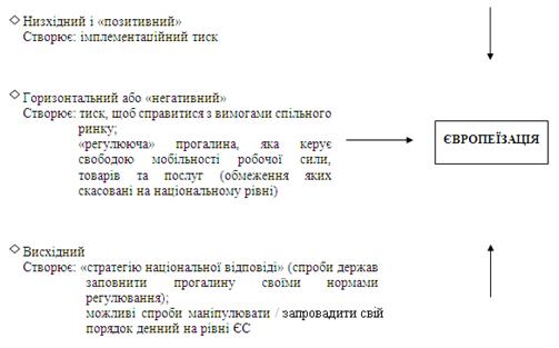 Отже, можна виділити два рівні європеїзації і, відповідно, утворення європейської економічної системи - це наднаціональний та внутрішньодержавний. Наднаціональний рівень концентрується на ефектах зовнішнього тиску, який чинить опір з боку ЄС на країн-членів, а внутрішньодержавний рівень ґрунтується на створенні та розвитку на європейському рівні окремих адміністративних структур [215, с. 11]. На внутрішньодержавному рівні відбуваються ті зміни структури, процесів, правил, стандартів, які здійснюються під впливом європейської інтеграції.