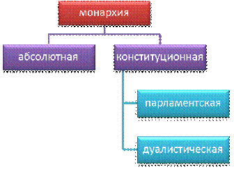 Абсолютная монархия характерна для феодального общества, выраженная для деспотического владычества, глава является единственным субъектом и создателем права. Глава осуществляет власть через систему государственной бюрократии.