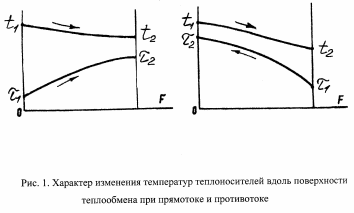 Характер изменения температур теплоносителей вдоль теплопередающей поверхности показаны на рис. 1.
