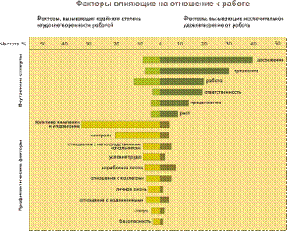3) отсутствие гигиенических факторов ведет к неудовлетворённости работой. В обычных условиях наличие гигиенических факторов воспринимается как что-то естественное, что приводит лишь к состоянию отсутствия неудовлетворённости и не оказывает мотивационного воздействия;