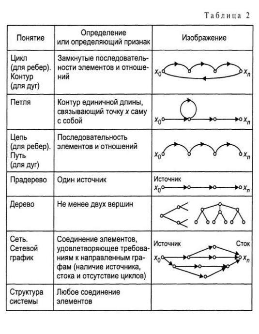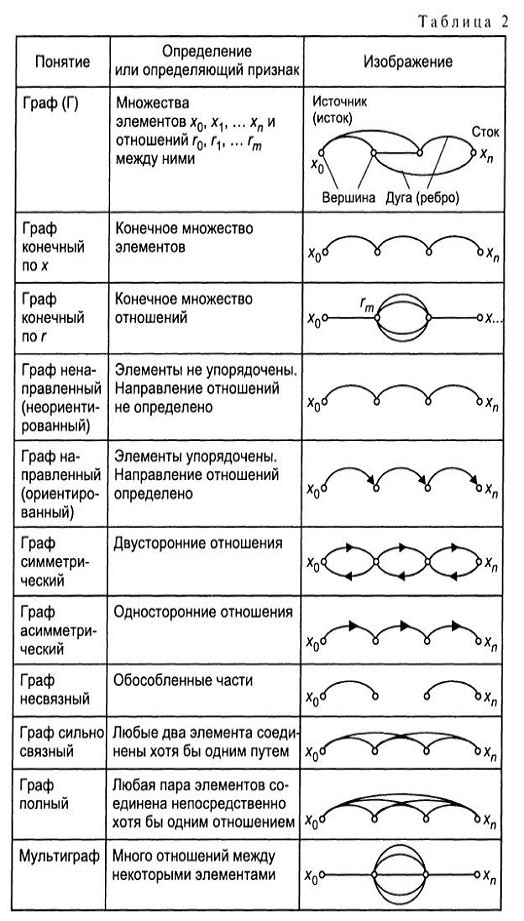 В то же время есть и возникшие на основе графических представлений методы, которые позволяют ставить и решать вопросы оптимизации процессов организации, управления, проектирования и являются математическими методами в традиционном смысле. Таковы, в частности, геометрия, теория графов. Основные понятия теории графов приведены в таблице 2, которая позволяет начать самостоятельное изучение теории графов.