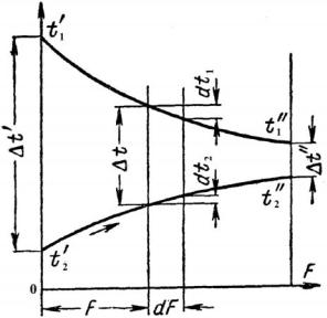 При противотоке температуры обоих теплоносителей вдоль поверхности теплообмена падают (см. рис. 4.2), и изменение температурного напора на участке dF равно