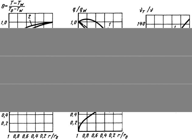 На рис. 4.5 показано распределение вдоль радиуса трубы r безразмерных температур θ, скорости wх(r)/w0, плотности теплового потока q(r)/qw, массовой скороcти ρwx/(ρw)0 и коэффициента турбулентного переноса импульса μт/μ при течении в трубе газа.