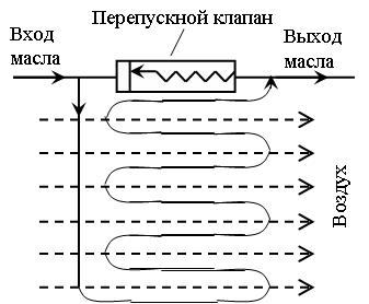 Набегающий воздух проходит между каналами. Площадь межканальных проходов увеличена за счет ребер, выполненных из фольги в форме зигзагов. Между входной и выходной камерами имеется перепускной клапан, который при повышенном давлении на входе отжимается от седла и может перепускать масло со входа сразу на выход. Причиной повышения давления на входе может быть засорение радиаторного элемента.