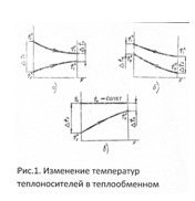 Характер изменения температур теплоносителей в процессе прохождения через аппарат (рис.1) зависит от особенностей процессов теплоотдачи, вида, расхода теплоносителей и направления их движения (схемы: прямоток, противоток, перекрестный ток или смешанный ток).