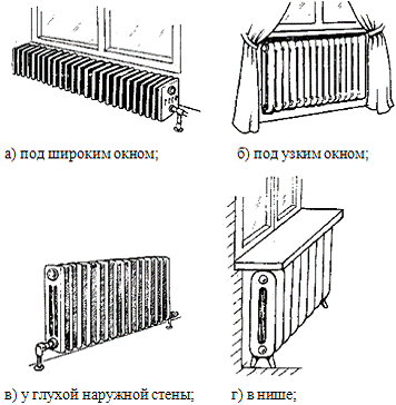 Если в наружной стене имеется подоконная ниша, то длина радиатора должна быть меньше ее длины, по крайней мере, на 400 мм при прямой подводке труб (600 мм - при подводке с уткой). Лишние секции выделяют в самостоятельный радиатор.