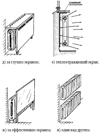 Глухой экран перед батареей, поднятый над полом на четверть высоты батареи и совершенно открытый сверху, позволяет увеличить на 5…10% теплосъем благодаря интенсивному движению воздуха между батареей и экраном (Приложение 10, А).