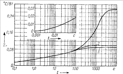 Экспериментально полученные зависимости переходных тепловых сопротивлений ZT от длительности воздействия импульса мощности при определенных способах охлаждения приводятся в справочных материалах для каждого типа приборов в виде кривых, как это показано на рисунке 3.2.