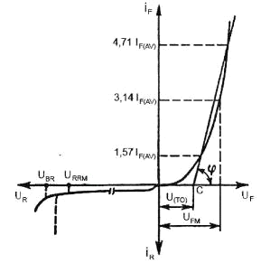 Динамическая (ВАХ) устанавливает зависимость между мгновенными значениями протекающего через прибор тока и напряжения на нем. Классификационная динамическая характеристика снимается в однофазной однополупериодной схеме выпрямления с активной нагрузкой при частоте 50 Гц, синусоидальной форме тока в угле проводимости 180°.