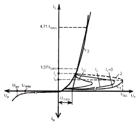 Обратная прямая (для тиристора) ветви (ВАХ), которые соответствуют состоянию низкой проводимости приборов, снимаются также с помощью осциллографа при максимально допустимой температуре полупроводниковой структуры. Они являются базовыми для определения приведенных ниже важнейших эксплуатационных (паспортных) параметров приборов по току и напряжению.