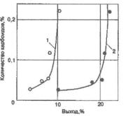 Рис. 15.1 Зависимость количества карбоидов от выхода продуктов крекинга: 1— газ; 2 — бензин