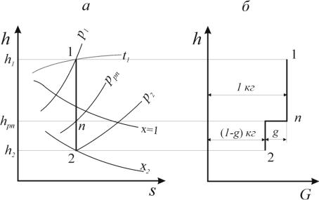 Рис. 37. График адиабатного расширения пара в турбине с промежуточным отбором (а) и изменения количества пара (б)