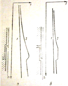Если место поступления воды в скважину (водоотдающий пласт) ниже места выхода воды из затрубного пространства в колонну или совпадает с ним (рис 2.3.,а), то нижняя граница относительного повышения кривой укажет место поступления воды в скважину (обводняющий пласт). Если же место поступления воды в скважину выше места выхода воды из затрубного пространства в колонну (рис 2.3.,б), то нижняя граница относительного повышения кривой покажет место поступления воды в колонну. Участок с затрубным движением будет в этом случае отмечаться постоянством температуры; на основании этого можно определить его границы.