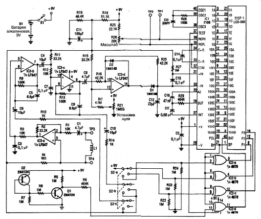 На вхід вимірювача магнітного поля підключена котушка з 12 витків , яка служить для виявлення магнітного поля. Для дистанційного зондування може використовуватися зовнішня котушка. Магнітне поле, що сприймається котушкою , проявляється у вигляді напруги , пропорційного напруженості поля і частоті. Воно надходить на вхід багато каскадного підсилювача IC3 - a , 1СЗ -Ь і 1СЗ -с . У першому каскаді підсилювача за допомогою резисторів R1 і R2 встановлено коефіцієнт посилення 3.3 . Загальний коефіцієнт перетворення складає 100 мкВ / мкТл або 100 мВ / мТл . Аналого-цифровий перетворювач ( АЦП) на мікросхемі IC1 має діапазон повної шкали 2 В. У зв'язку з цим мінімальний діапазон виміру складе 20 мТл на всю шкалу. ОУ 1СЗ - а підсилює сигнал до нормованого рівня 100 мкВ / мкТл . Далі сигнал посилюється в 1,100 , або 10 000 раз ОУ 1СЗ -Ь і 1СЗ -с . Три каскаду посилення забезпечують діапазони 2 мТл , 200 мкТл і 2 мкТл на всю шкалу. Елементи R3 і СЗ і R12 і С7 встановлюють частоту зрізу частотної характеристики в точці 20 кГц , яка компенсує пропорційну частоті чутливість котушки зв'язку . ОУ IC3 - d виконує функцію точного випрямляча і пікового детектора. Вихідний сигнал з нього надходить на АЦП і РКІ дисплей. Компоненти R25 - R29 і С13 - С17 використовуються 101, щоб встановити час перетворення, тактову частоту і опорна напруга. Десяткові точки управляються IC2 залежно від обраного перемикачем S2 діапазону. Транзистори Q1 і Q2 відчувають зниження напруги батареї і включають сигналізацію розряду батареї на РКІ при досягненні рівня 7 В.