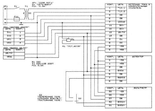 Прилад складається з наступних основних вузлів: джерело струму і вимірювальний підсилювач із стабілізаторами напруги , детектор , цифровий вольтметр з аналого-цифровим перетворювачем (АЦП ) і світлодіодним індикатором , щуп з датчиком Холла. Живлення приладу здійснюється від мережі змінного струму напругою 220 В частотою 50 Гц через захисний запобіжник FU1 і мережевий вимикач S1. Трансформатор T1 знижує мережеве напругу до необхідного рівня. З вторинної обмотки мережевого трансформатора T1 змінну напругу подається на плату джерела струму і вимірювального підсилювача , де за допомогою випрямляча , фільтрів і стабілізаторів виробляються необхідні для живлення електронних вузлів приладу постійні напруги.