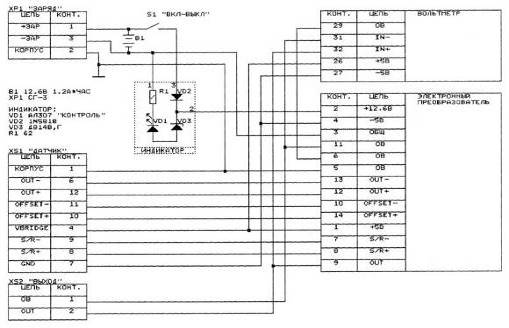 Залежно від типу щупа (С- або М- тип) використовується один з датчиків. За допомогою електронного перетворювача виробляються сигнали управління , що подаються на датчик , і обробляються вихідні сигнали датчика. Вихідна напруга перетворювача вимірюється за допомогою вбудованого цифрового вольтметра [ 2 ] , що складається з аналого-цифрового перетворювача семисегментним індикатором . Для живлення схем приладу використовується акумуляторна батарея із стабілізаторами напруги ( джерело живлення) .