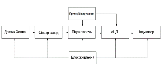 Отже якщо брати за основу прилади на основі датчика Холла то в загальному у приладі мають бути такі блоки: