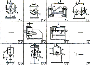 В 5-м ряду приведены схемы тестомесильных машин с горизонтальными месильными валами прямой, наклонной и Z-образной формы, вращающиеся в полуцилиндрических рабочих емкостях. Для разгрузки месильной емкости от теста они поворачиваются вокруг горизонтальной оси в сторону разгрузки.