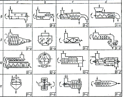 В 8-м ряду показаны схемы одновальных горизонтальных машин, расположенных в порядке возрастания интенсивности замеса.