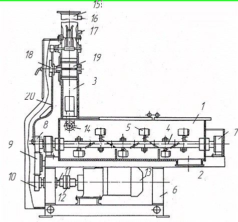 -d) - двухкамерная одновальная смесительная машина с цилиндрической рабочей камерой. В первой смесительной камере на валу закреплен шнек, а в камере интенсивного замеса на валу с помощью эластичных втулок закреплен с возможностью осевого колебания барабан с лопастями. На внутренней поверхности рабочей камеры установлены наклонные лопасти, при работе внутренний барабан колеблется на эластичных втулках, вибрация интенсифицирует замес и способствует улучшению качества готовых изделий.