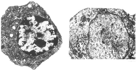 А) преобладание эухроматина и наличие ядрышек; Б) преобладание гетерохроматина; В) малое количество пор; Г) отсутствие ядрышка;