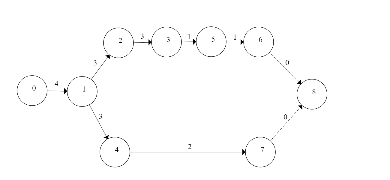 Критический путь: 0 – 1 – 2 – 3 – 5 – 6 – 8. К.п. = 12