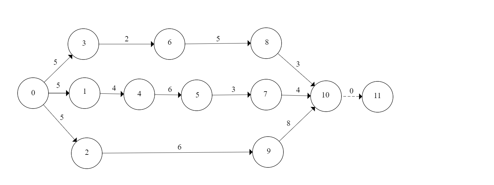 Виды работ входящие в критический путь: 0 – 1 – 4 – 5 – 7 – 10 – 11.