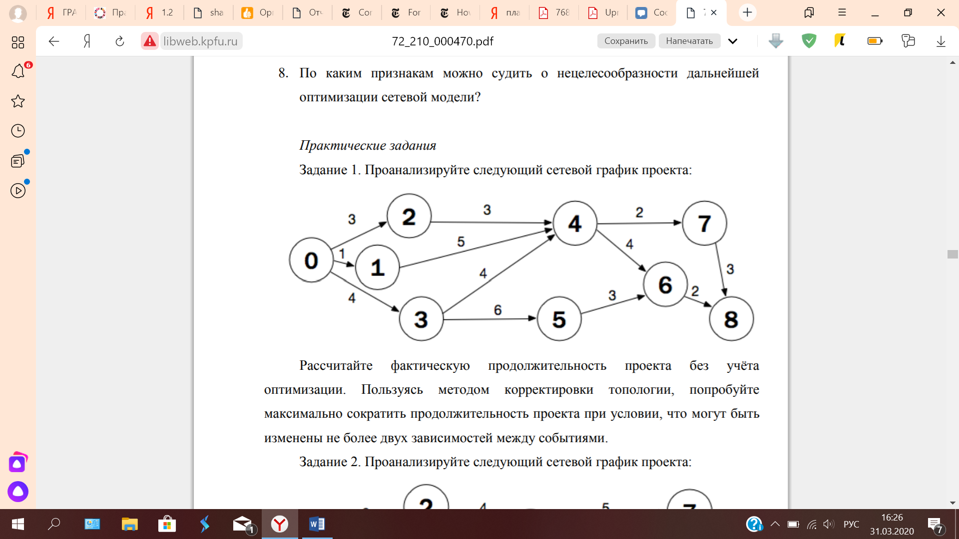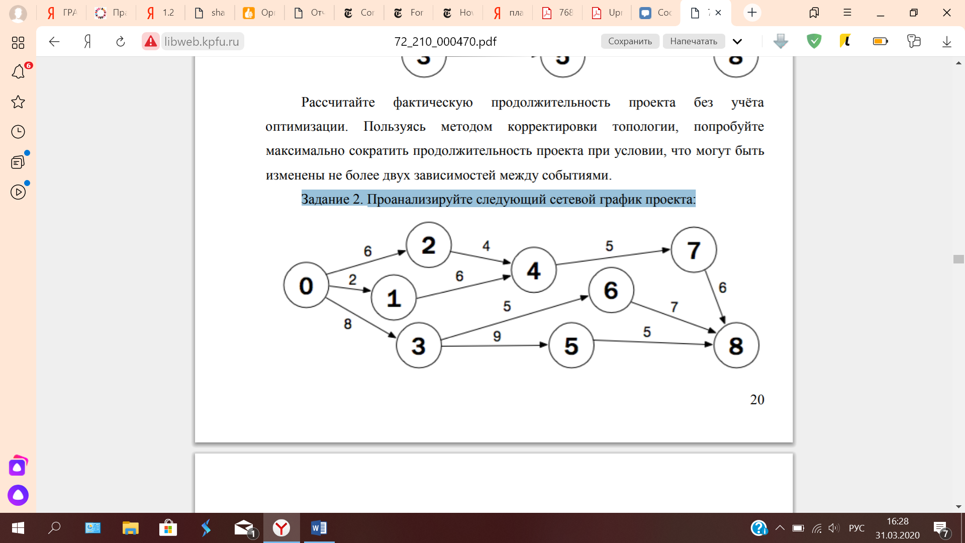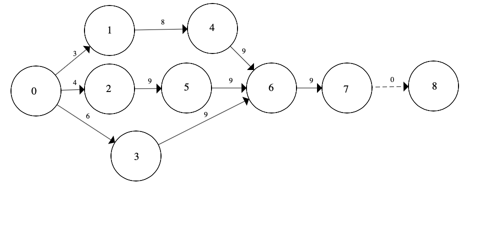 Критический путь: 0-2-5-6-7-8 = 4+9+9+9+0 = 31