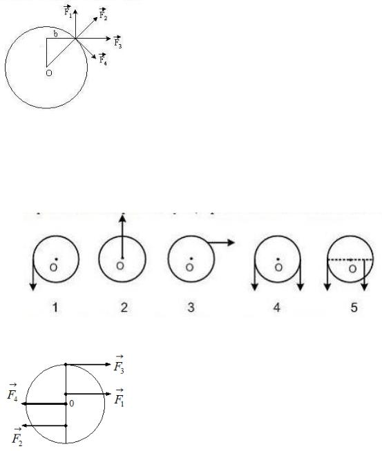 3.2. К диску, который может свободно вращаться вокруг оси, проходящей через точку О, прикладывают одинаковые по величине силы (см. рис.). Момент сил будет максимальным в положении...