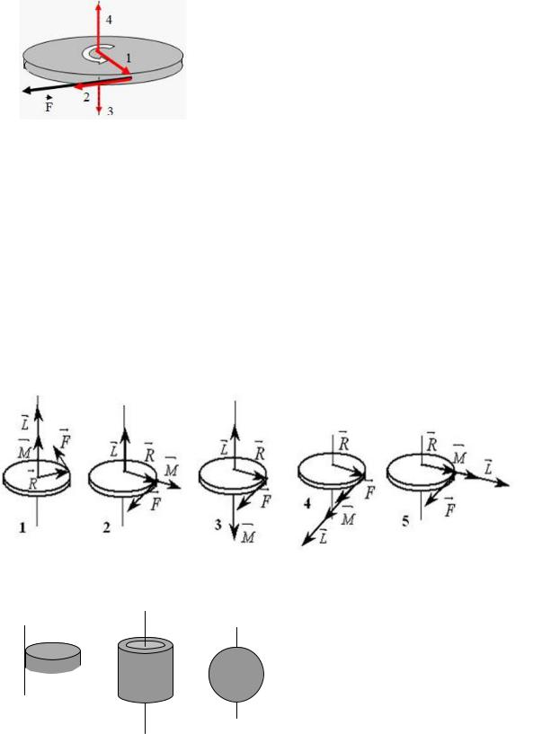 3.9. Диск равномерно вращается вокруг вертикальной оси в направлении, указанном на рисунке белой стрелкой. В некоторый момент времени к ободу диска была приложена сила, направленная по касательной. Пра-