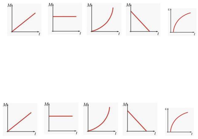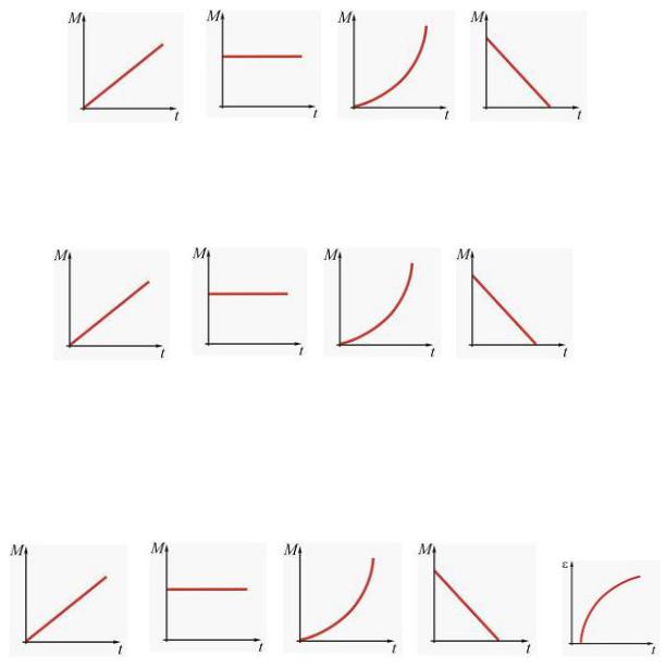 3.27. Абсолютно твердое тело вращается с угловым ускорением, изменяющимся по закону = t, где – некоторая положительная константа. Момент инерции тела остается постоянным в течение всего времени. Зависимость от времени момента сил, действующих на тело, определяется графиком...