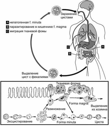 а) мелкая вегетативная (просветная) - forma minuta (8-20 мк), обитает в просвете кишечника, питается его содержимым. Непатогенна (не вызывает болезни).